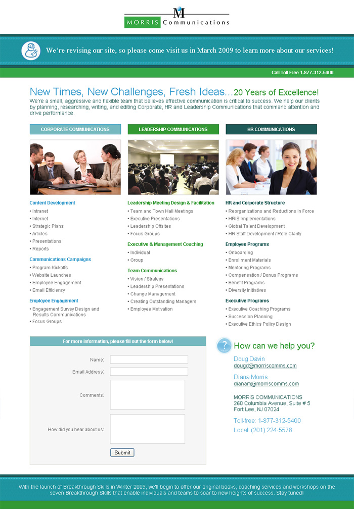 Promotional page created for Morris Communications to inform their clients that a new corporate website is currently in production and will be launched soon. In the meantime, this serves as a tool for the company to communicate with its clients and sustaining an effective web presence.